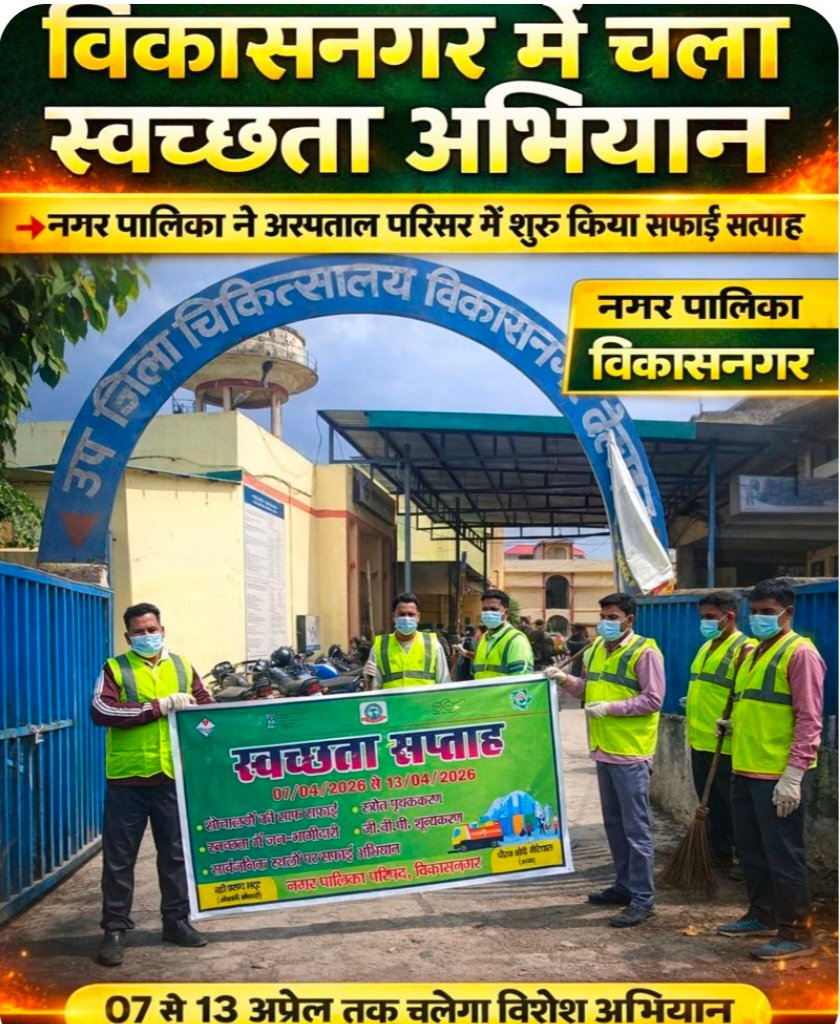 विकासनगर में स्वच्छता सप्ताह की शुरुआत, नगर पालिका ने संभाली कमान विकासनगर। नगर पालिका परिषद द्वारा स्वच्छता को लेकर विशेष अभियान की शुरुआत की गई है। संयुक्त जिला चिकित्सालय विकासनगर परिसर में “स्वच्छता सप्ताह” के तहत सफाई अभियान चलाया गया। यह अभियान 07 अप्रैल से 13 अप्रैल 2026 तक संचालित किया जाएगा।