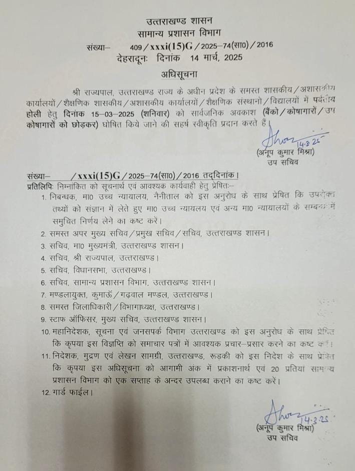 पर्वतीय होली के अवसर पर 15 मार्च को सार्वजनिक अवकाश घोषित, शासनादेश जारी