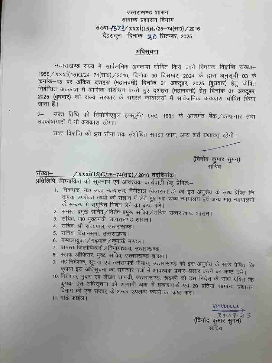 अब प्रदेश में दिनांक 01 अक्टूबर 2025 को राज्य सरकार के सभी कार्यालयों में सार्वजनिक अवकाश घोषित किया गया है। बैंक एवं कोषागारों में भी यह अवकाश रहेगा।